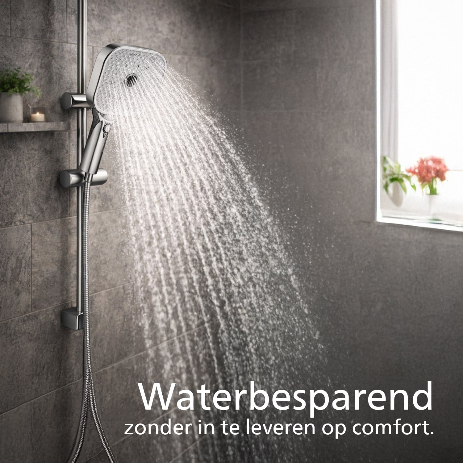 Gemiddeld bespaar je tot 20-30% water in vergelijking met een conventionele douchekop. Dit komt doordat er lucht bijgemengd wordt en de doorstroming is geoptimaliseerd. Je merkt het bijna niet tijdens het douchen (de straal blijft comfortabel), maar op jaarbasis kun je flink op je water- en energierekening besparen. De exacte besparing hangt af van jouw oude douchekop en waterdruk, maar vele gebruikers hebben al gemerkt dat ze duurzamer douchen zonder in te leveren op comfort.